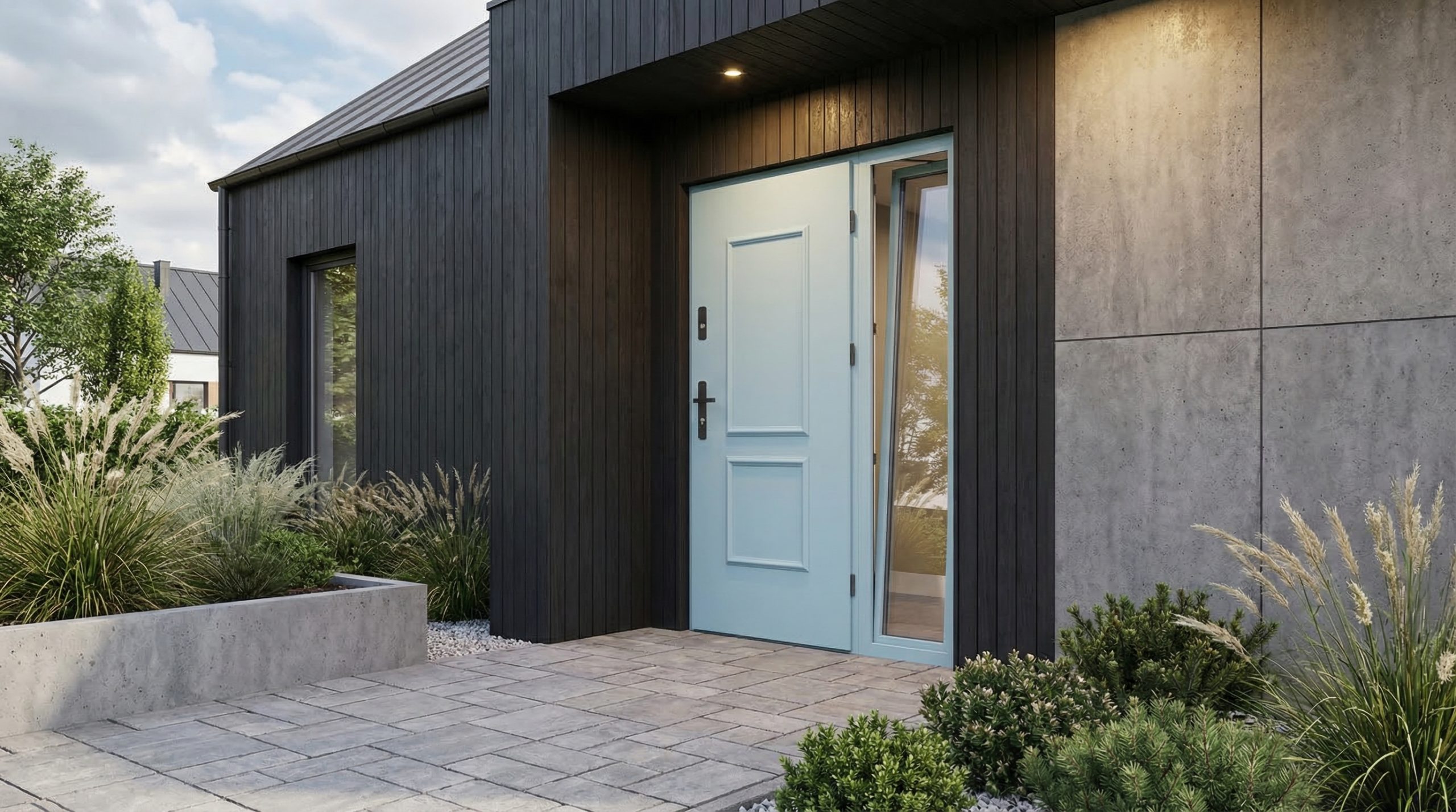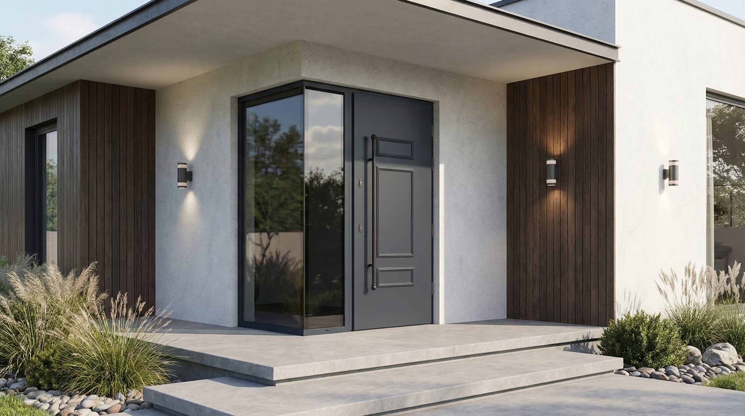 Glass Corner otwiera strefę wejścia na światło z dwóch stron i nadaje jej lżejszy, bardziej architektoniczny charakter. To rozwiązanie, które zmienia nie tylko wygląd drzwi, ale odbiór całej bryły.