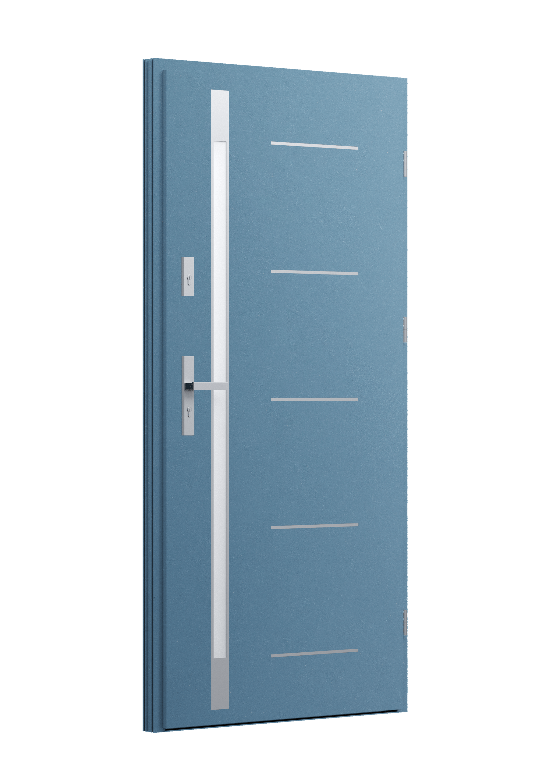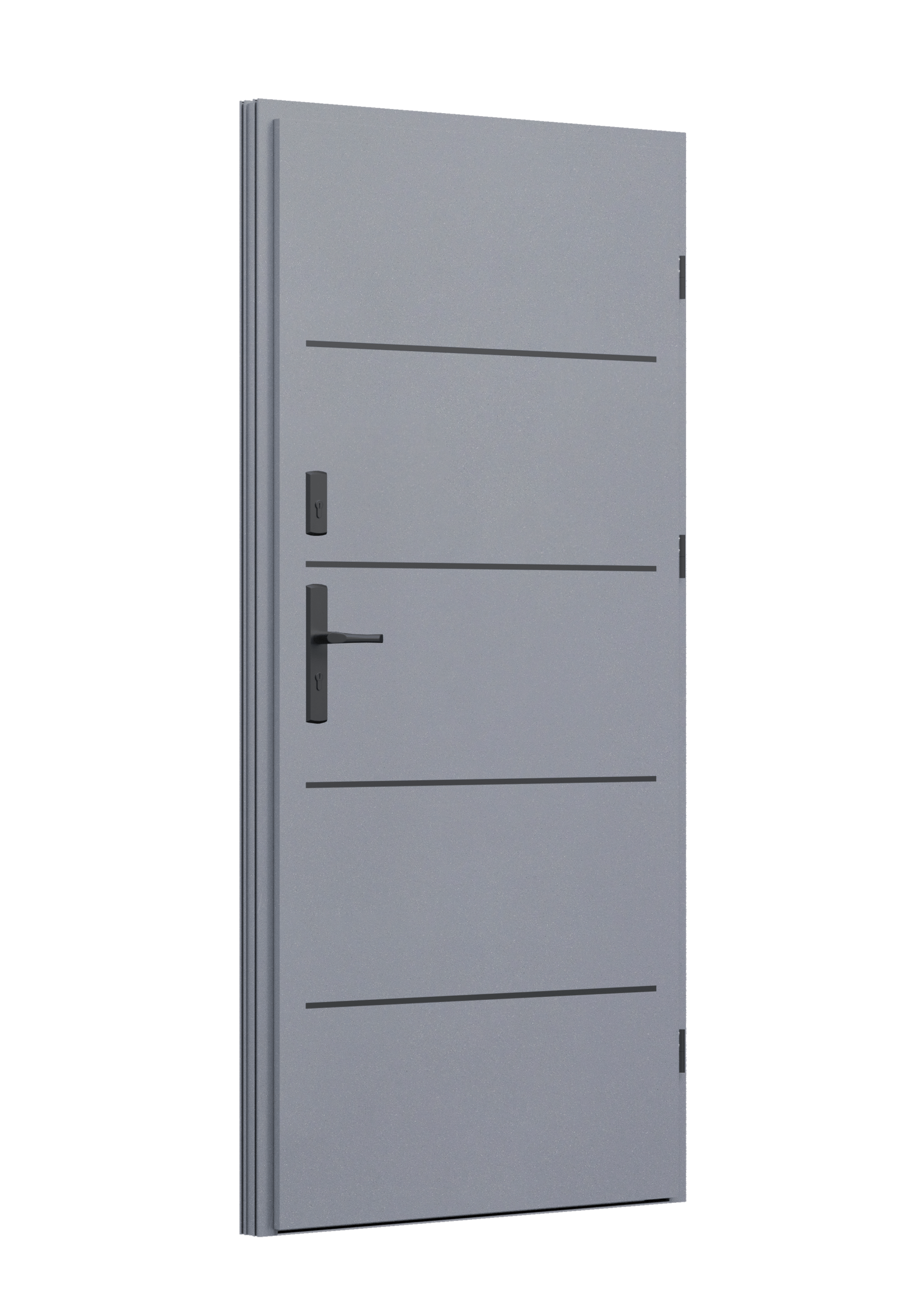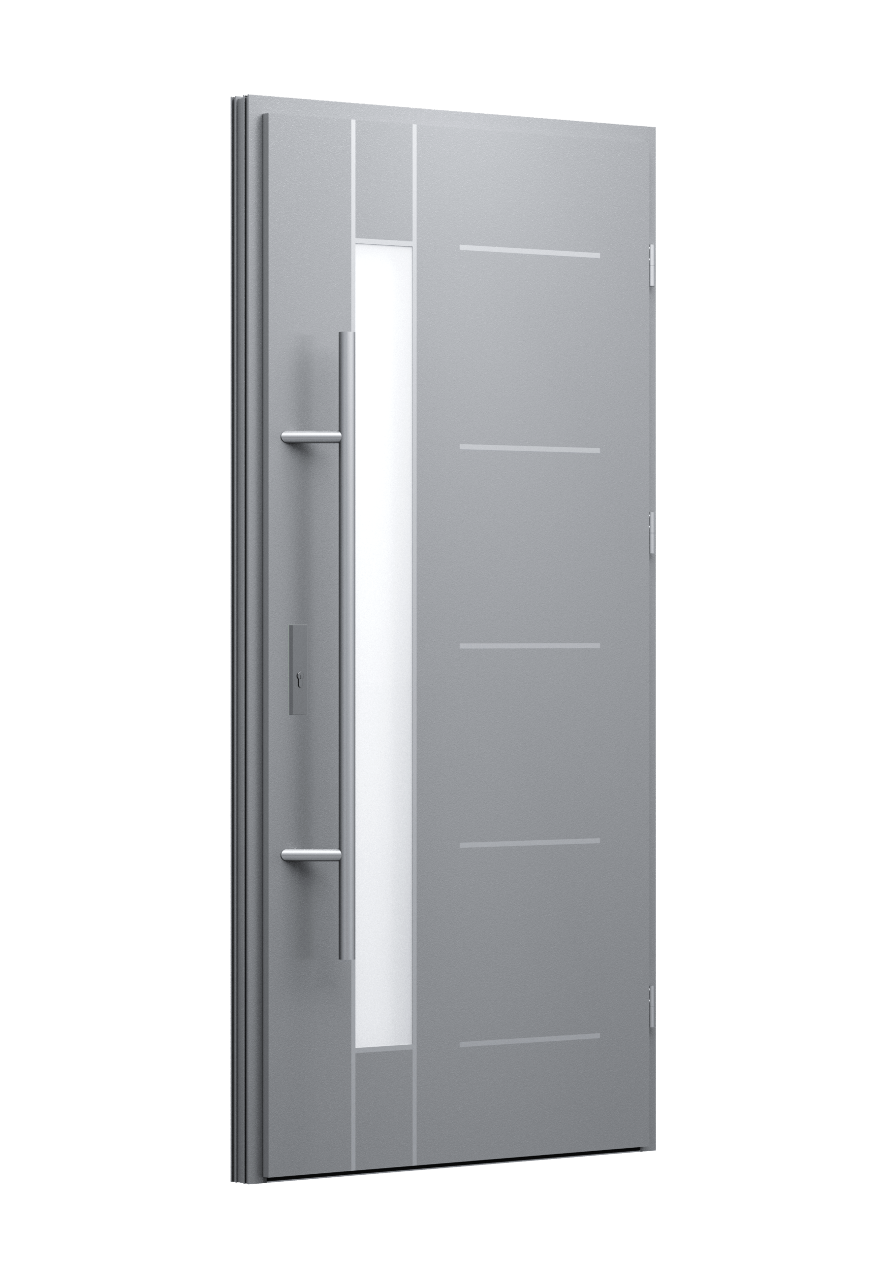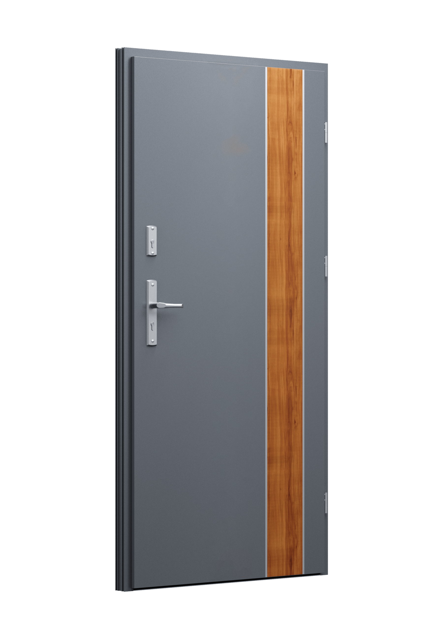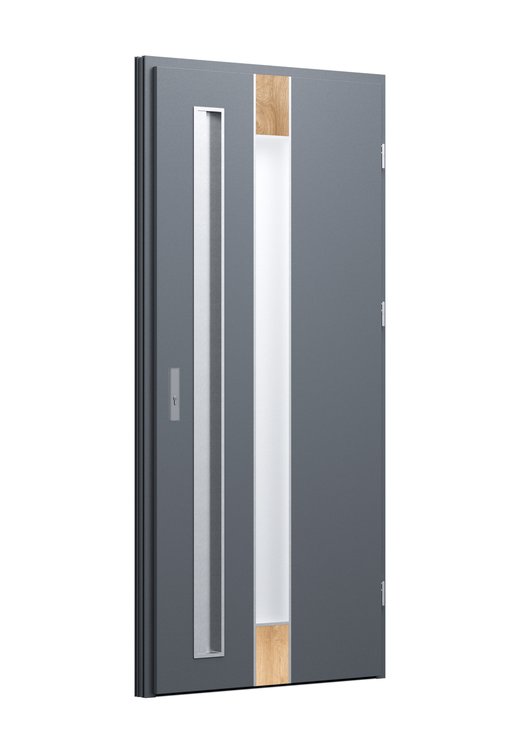 Drzwi z aluminiowymi intarsjami idealnie zlicowanymi z powierzchnią skrzydła. Geometryczny, uporządkowany rytm podkreśla nowoczesny charakter. Minimalizm, który odkrywa detale dopiero z bliska. Kolekcja Future pozwala świadomie pracować kolorem. Wariant „mixkolor” umożliwia zestawienie różnych barw w obrębie jednego skrzydła. Swoboda konfiguracji daje pełną kontrolę nad efektem i dopasowaniem drzwi do fasady budynku.