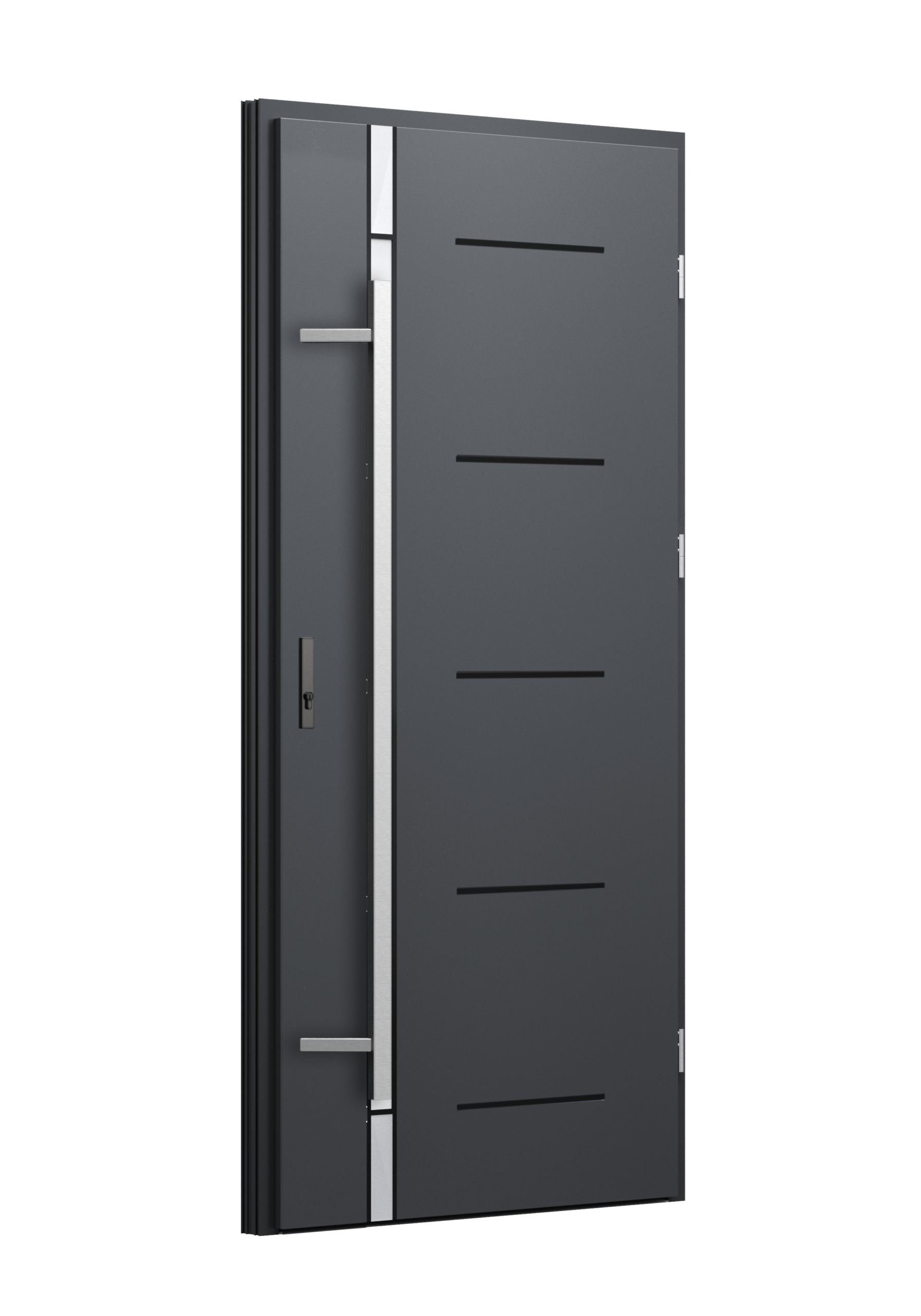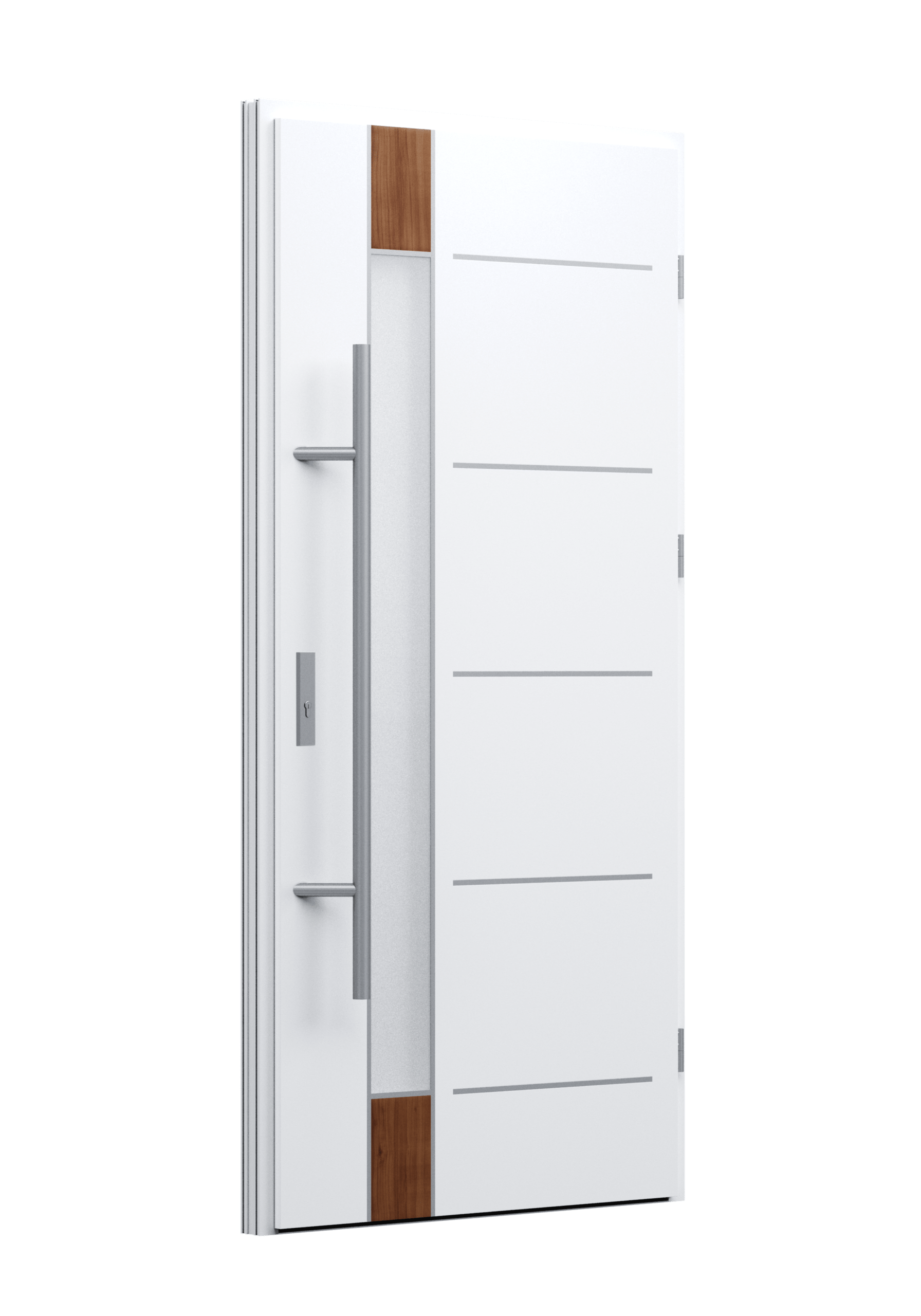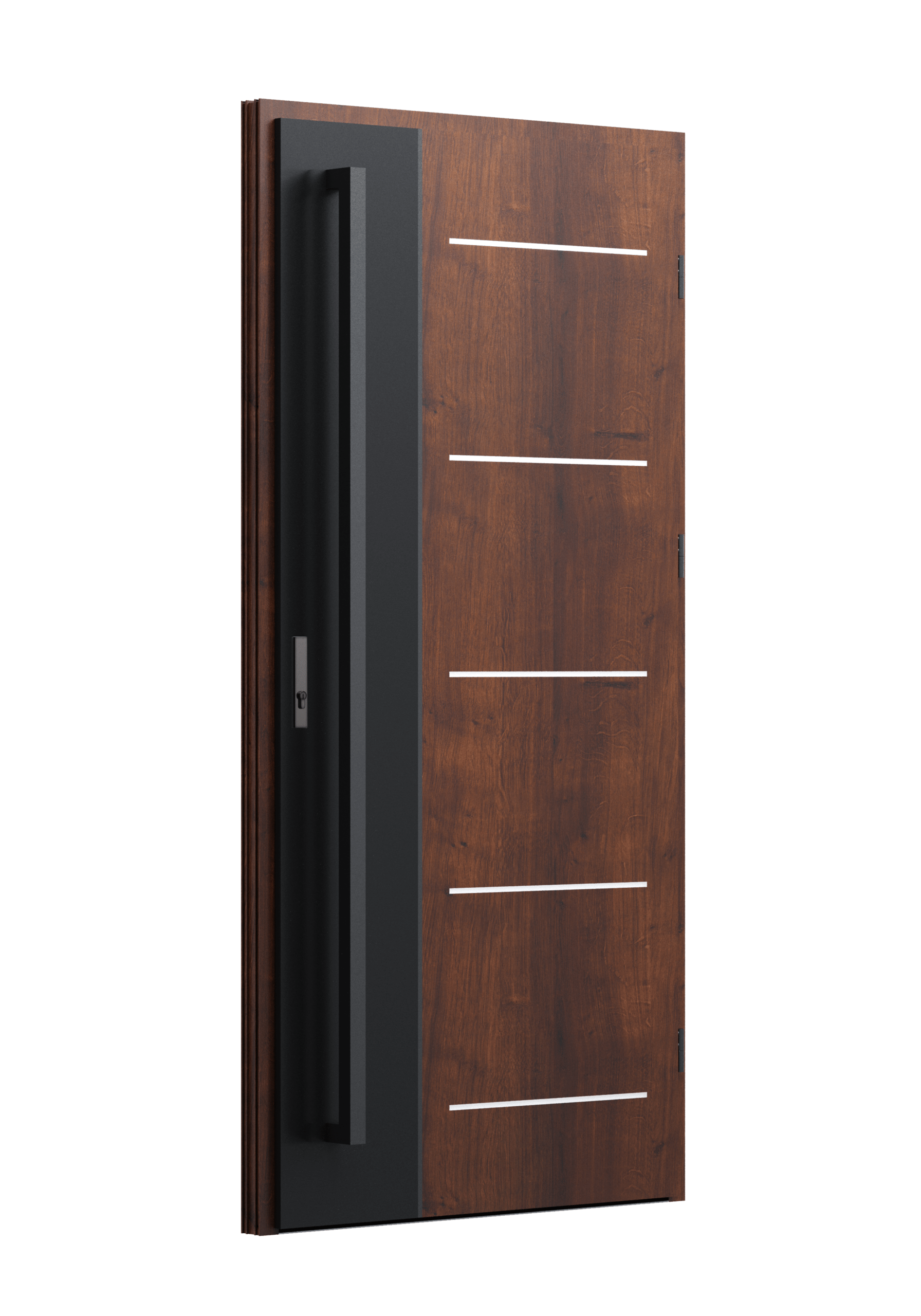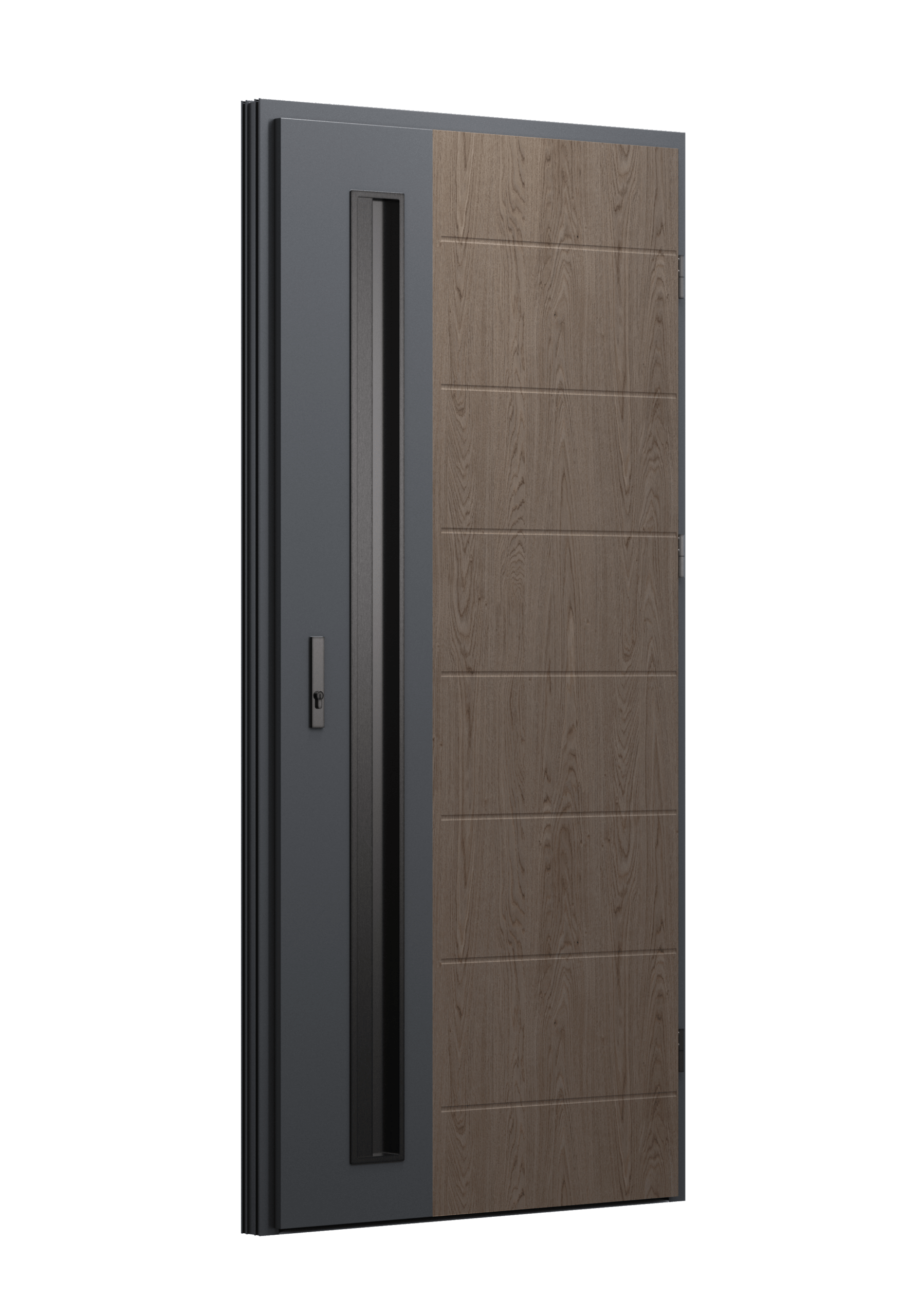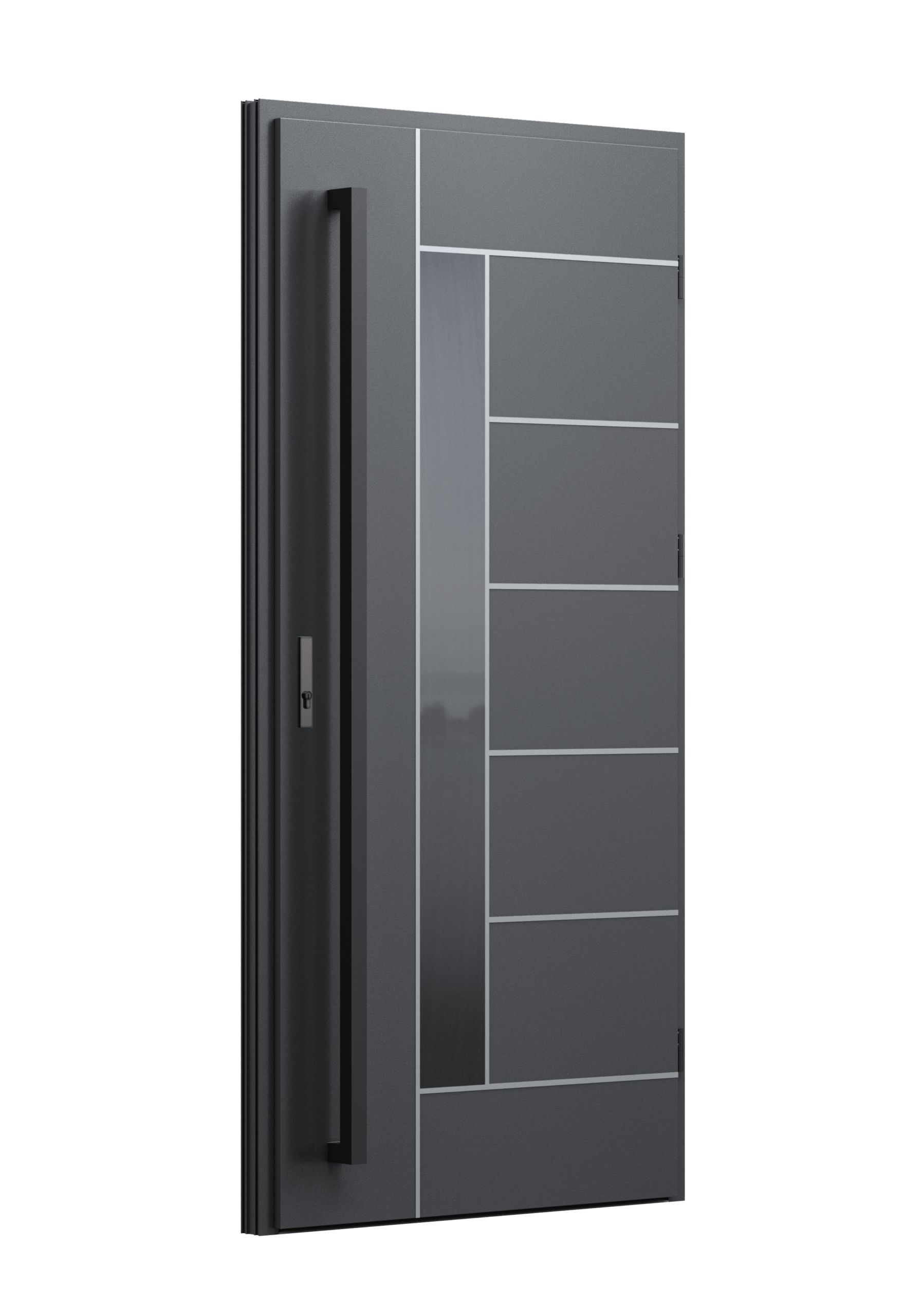 Drzwi z aluminiowymi intarsjami idealnie zlicowanymi z powierzchnią skrzydła. Geometryczny, uporządkowany rytm podkreśla nowoczesny charakter. Minimalizm, który odkrywa detale dopiero z bliska. Kolekcja Future pozwala świadomie pracować kolorem. Wariant „mixkolor” umożliwia zestawienie różnych barw w obrębie jednego skrzydła. Swoboda konfiguracji daje pełną kontrolę nad efektem i dopasowaniem drzwi do fasady budynku.