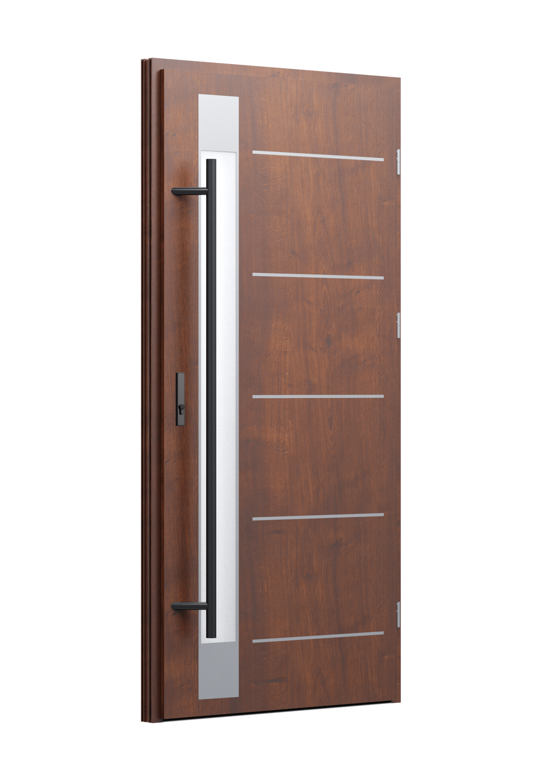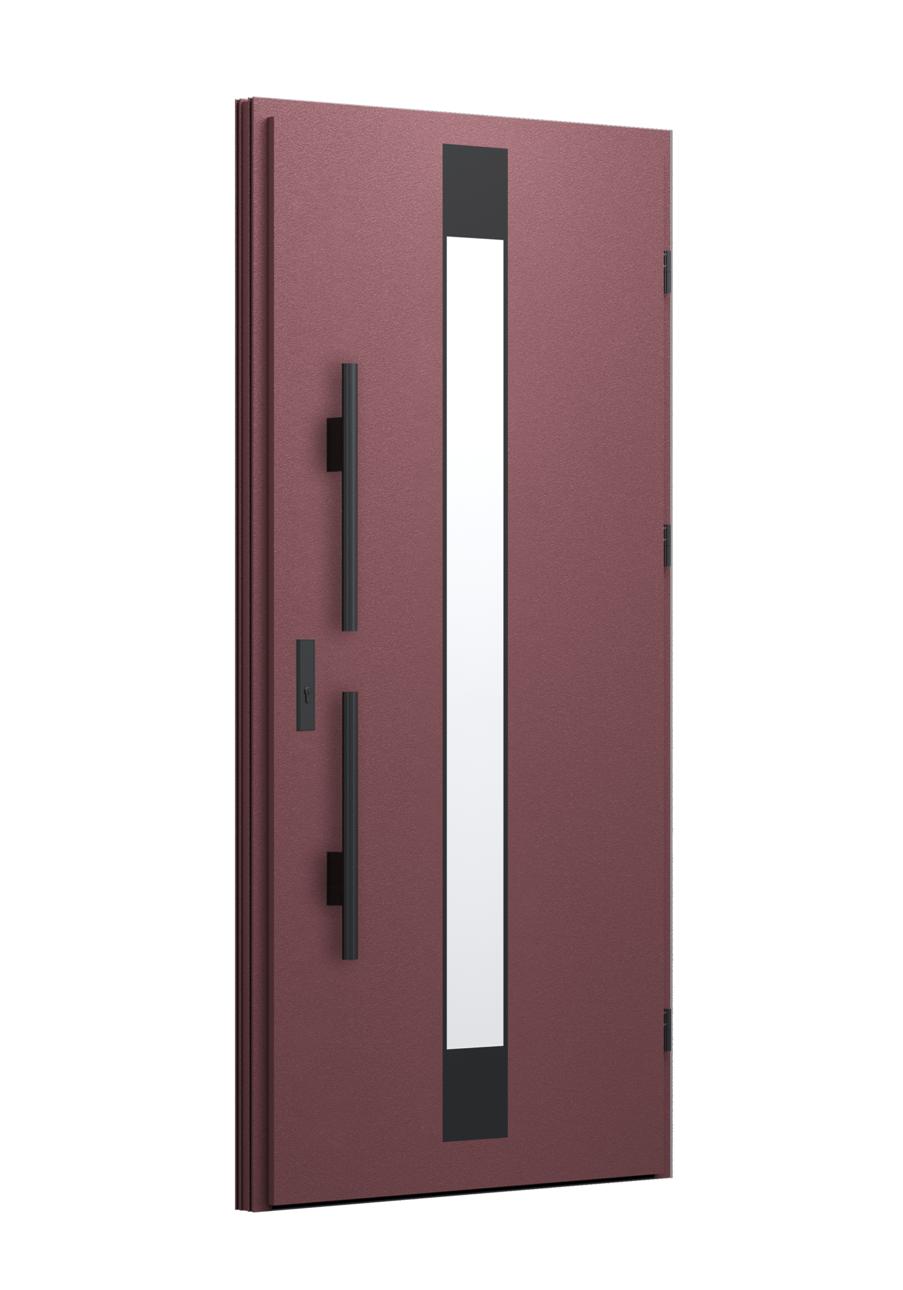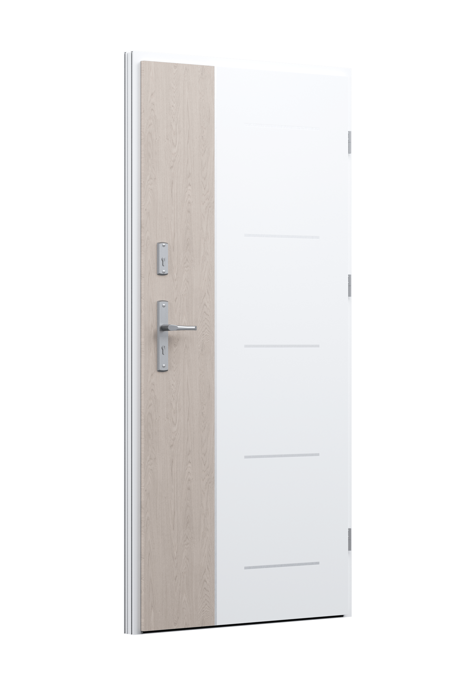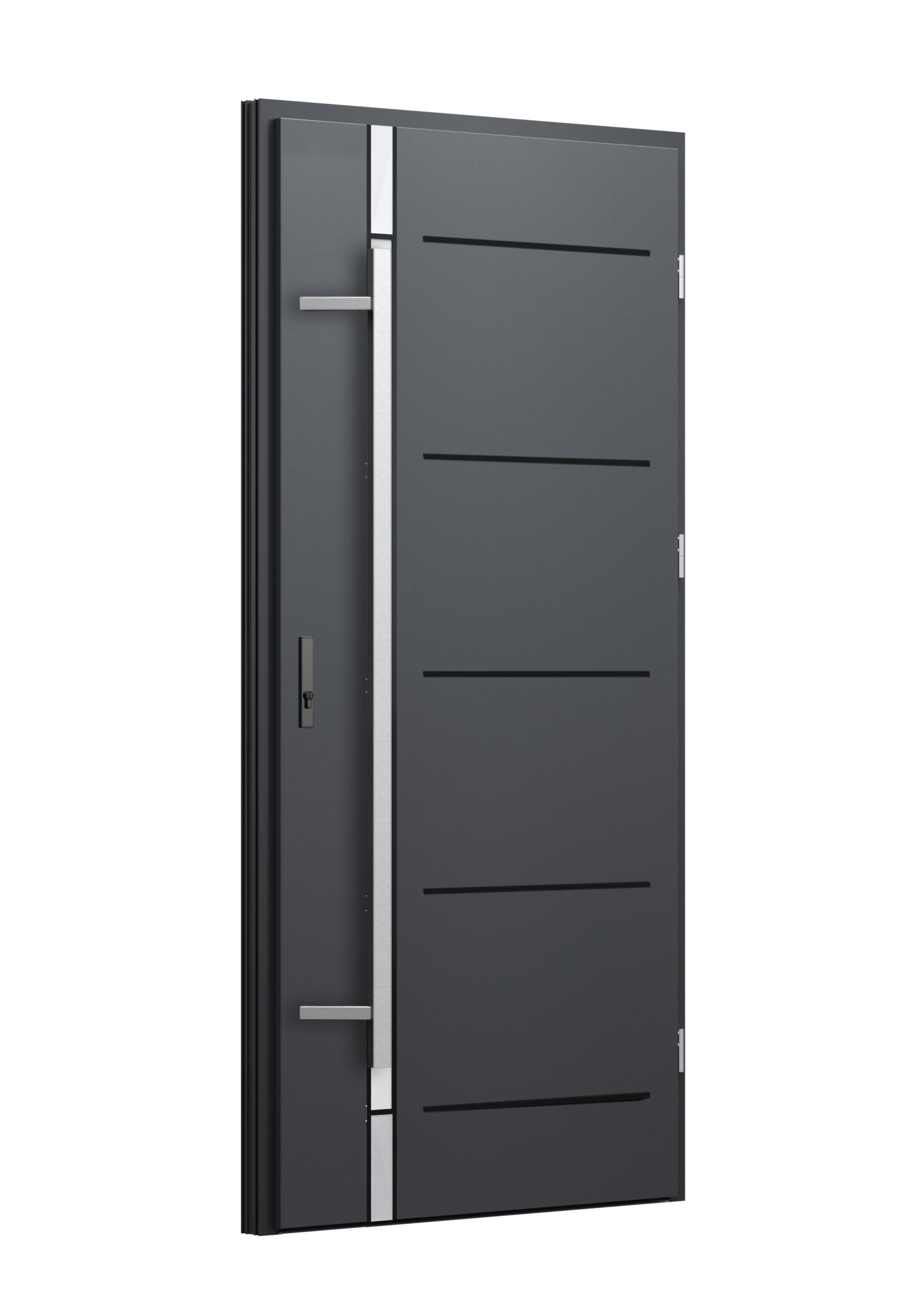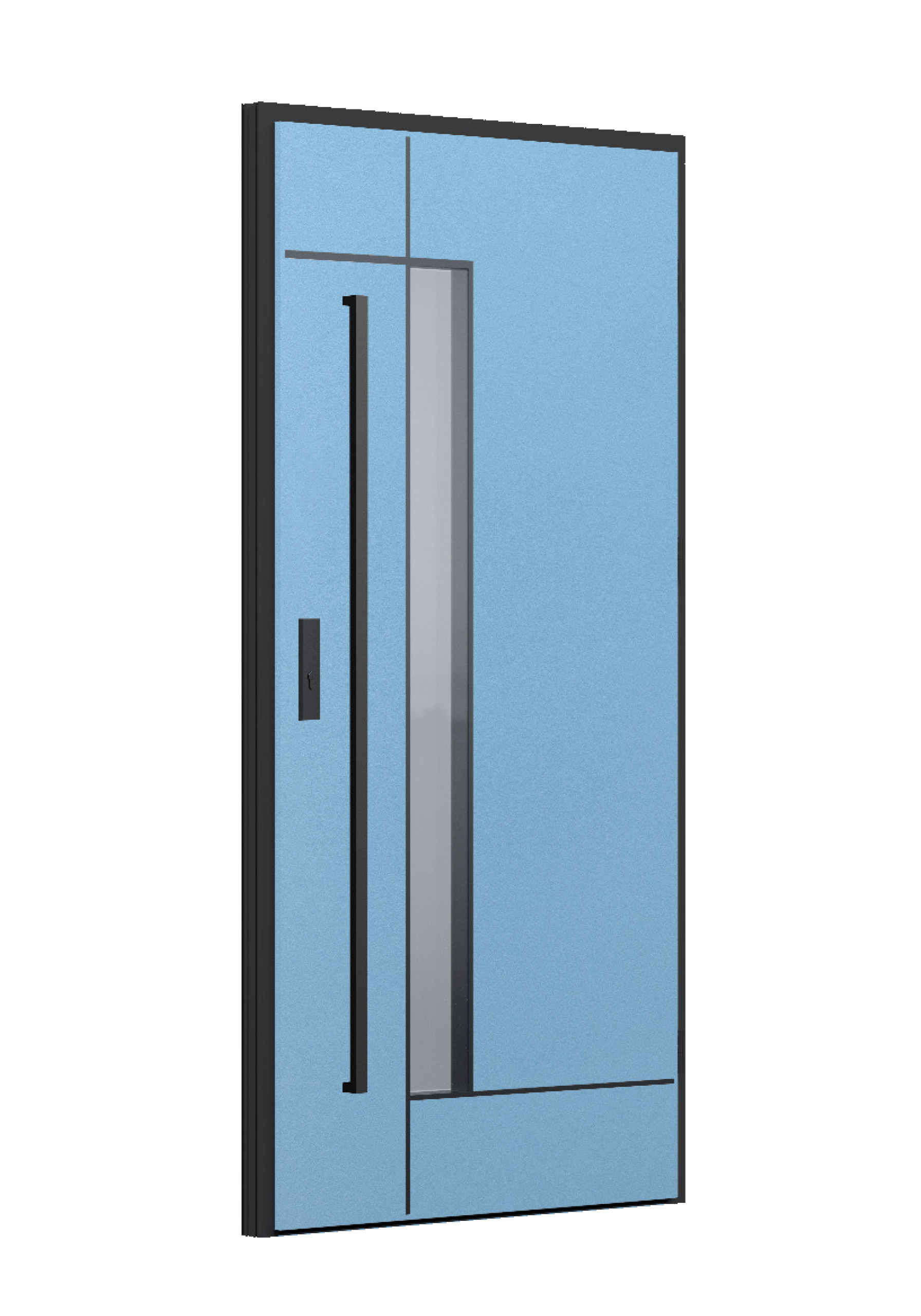 Drzwi z aluminiowymi intarsjami idealnie zlicowanymi z powierzchnią skrzydła. Geometryczny, uporządkowany rytm podkreśla nowoczesny charakter. Minimalizm, który odkrywa detale dopiero z bliska. Kolekcja Future pozwala świadomie pracować kolorem. Wariant „mixkolor” umożliwia zestawienie różnych barw w obrębie jednego skrzydła. Swoboda konfiguracji daje pełną kontrolę nad efektem i dopasowaniem drzwi do fasady budynku.